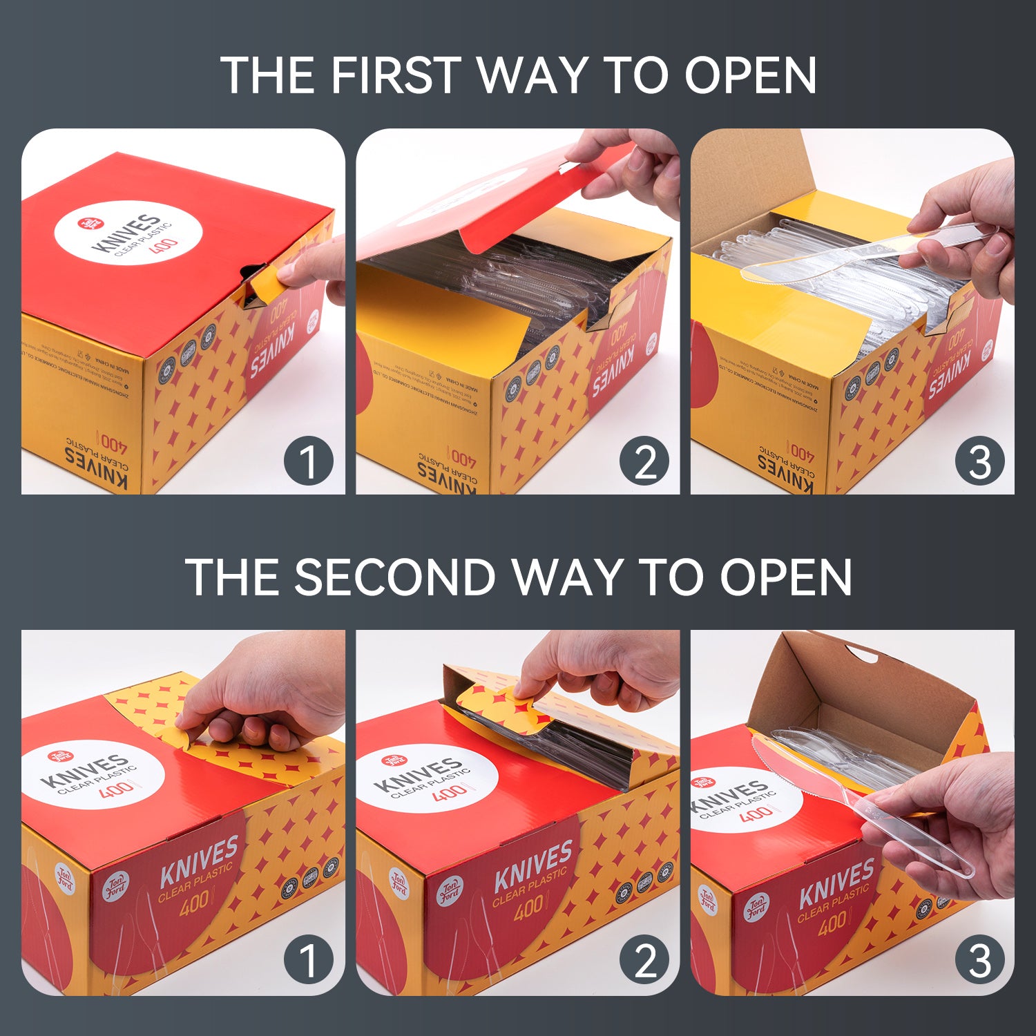 - CONVENIENT PACKAGE: There are 400 pcs of disposable plastic knives in the carton, and the film-wrapped carton ensures that you receive clean and complete disposable cutlery. The carton is easy to tear and store, and you can choose different ways to open the carton