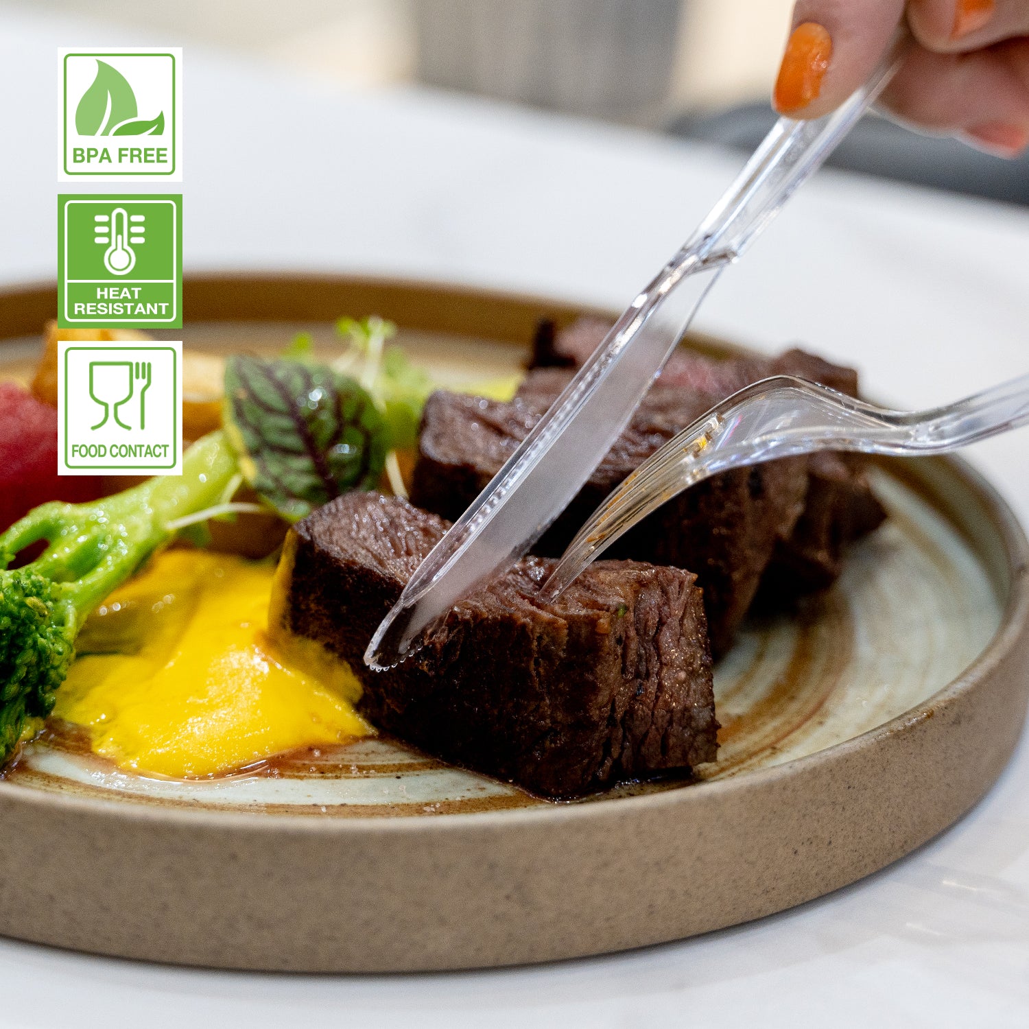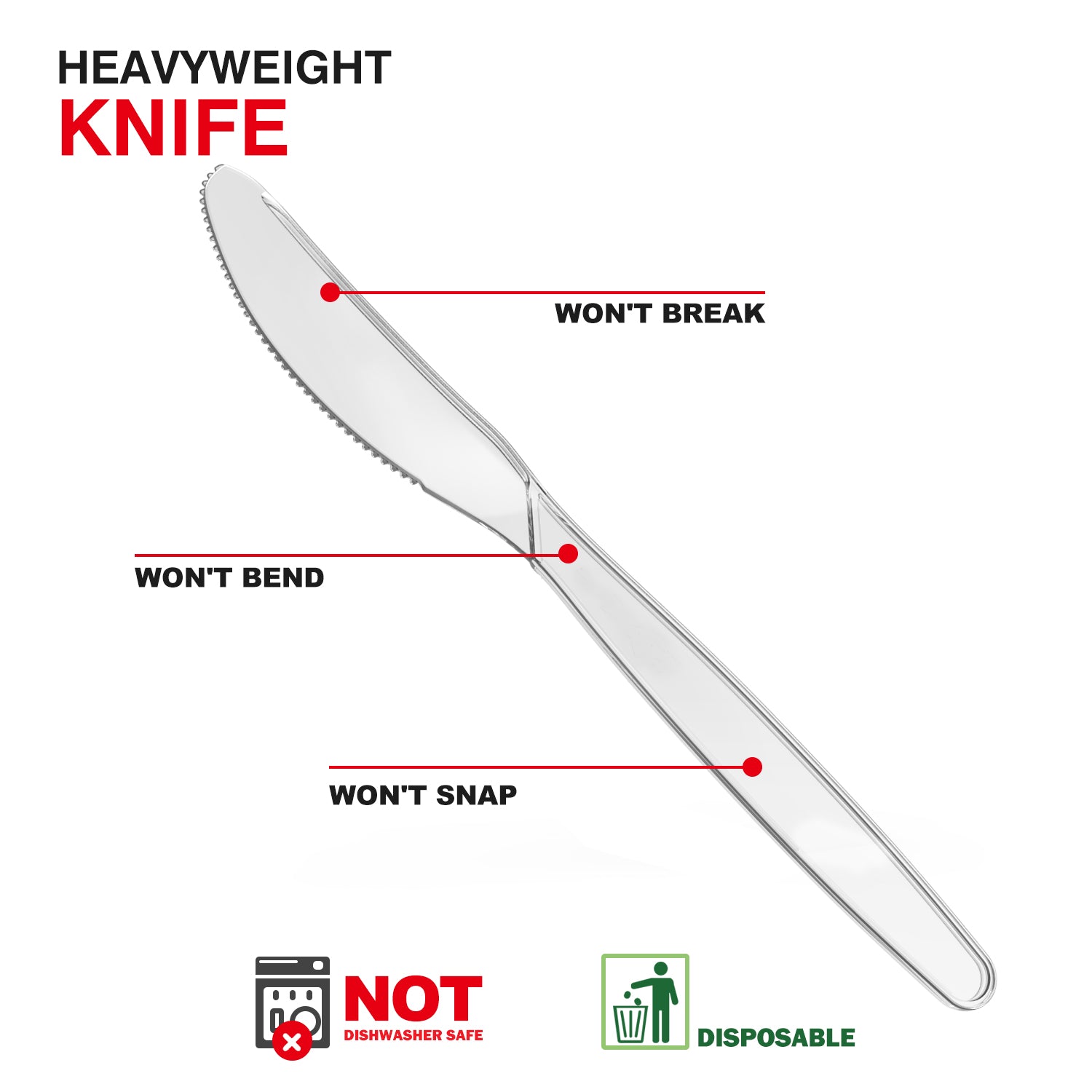 - SUITABLE FOR HOT FOODS: The disposable knives are made of a heat-resistant material. Made from quality plastic materials that are colorless and BPA free.