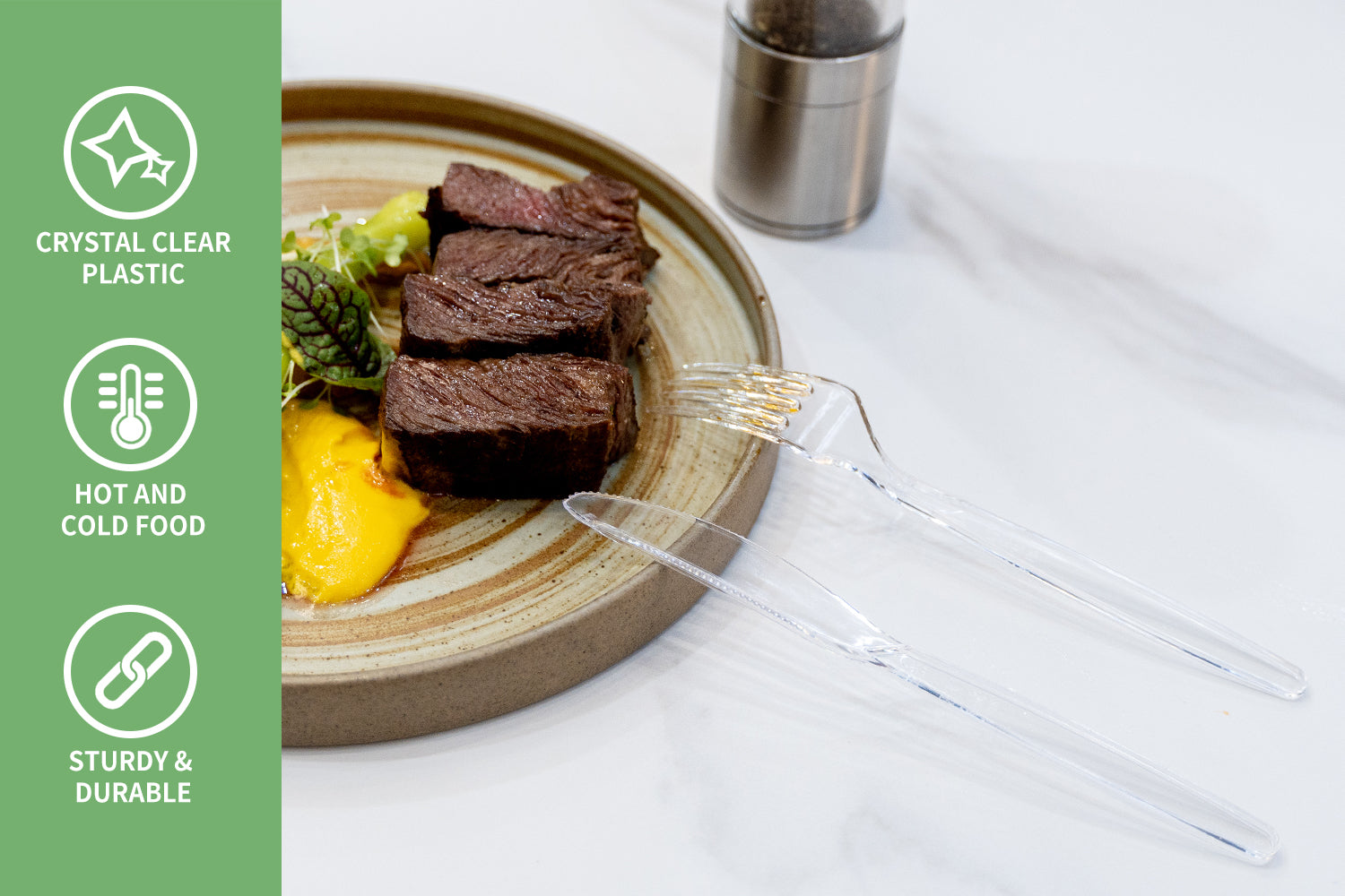 - GREAT FOR MEATS: The plastic cutlery is made of heavy duty PS material with high strength and toughness, which is more durable than ordinary plastics. It is break-resistant, and the curved serrations make it easy to cut through food. Use it to cut steak easily.